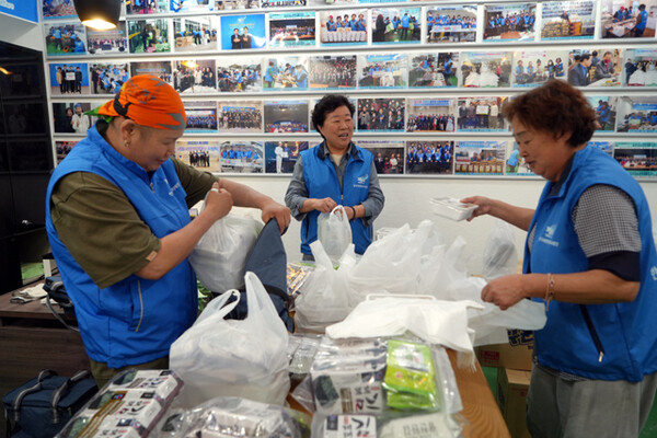 ▲밑반찬을 포장하고 있는 파란천사 위원들