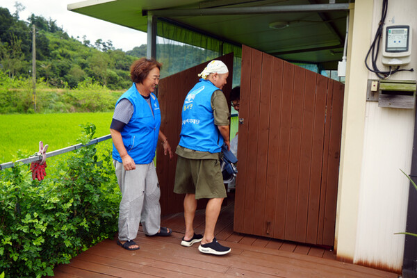 ▲복지사각지대 가구방문을 통해 반찬봉사와 안부를 살피고있는 파란천사 위원들